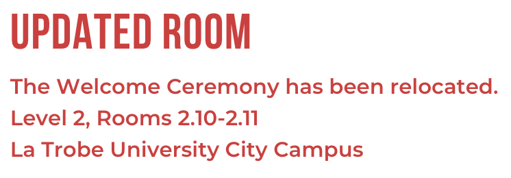 After the Welcome Ceremony, a welcome reception will be offered for participants who registered online to attend. It will be a moment of camaraderie and celebration, while enjoying refreshments and snacks, to mark the beginning of our LASA/Oceania-Asia 2025. Please remember to bring your invitations, which will be provided at the registration area (third floor of the La Trobe University City Campus building), along with your name badges.