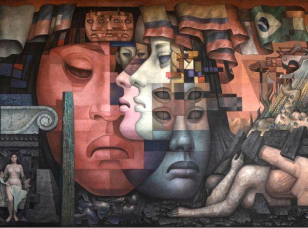 The Presencia de América Latina mural was created by Mexican artist Jorge González Camarena in 1965. His acrylic painting on stucco fills the entrance hall lobby of the Casa de Arte (House of Art) of the Universidad de Concepción in Concepción, Chile.